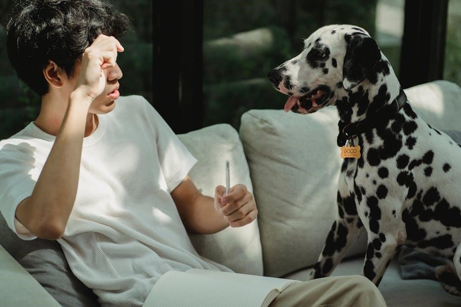 Confusion can arise if signals are inconsistent or too similar. Review your dog training hand signals chart PDF to ensure clarity. If your dog isn’t responding, simplify the signal or break down the command into smaller steps. Consider if distractions are hindering focus during training sessions.
